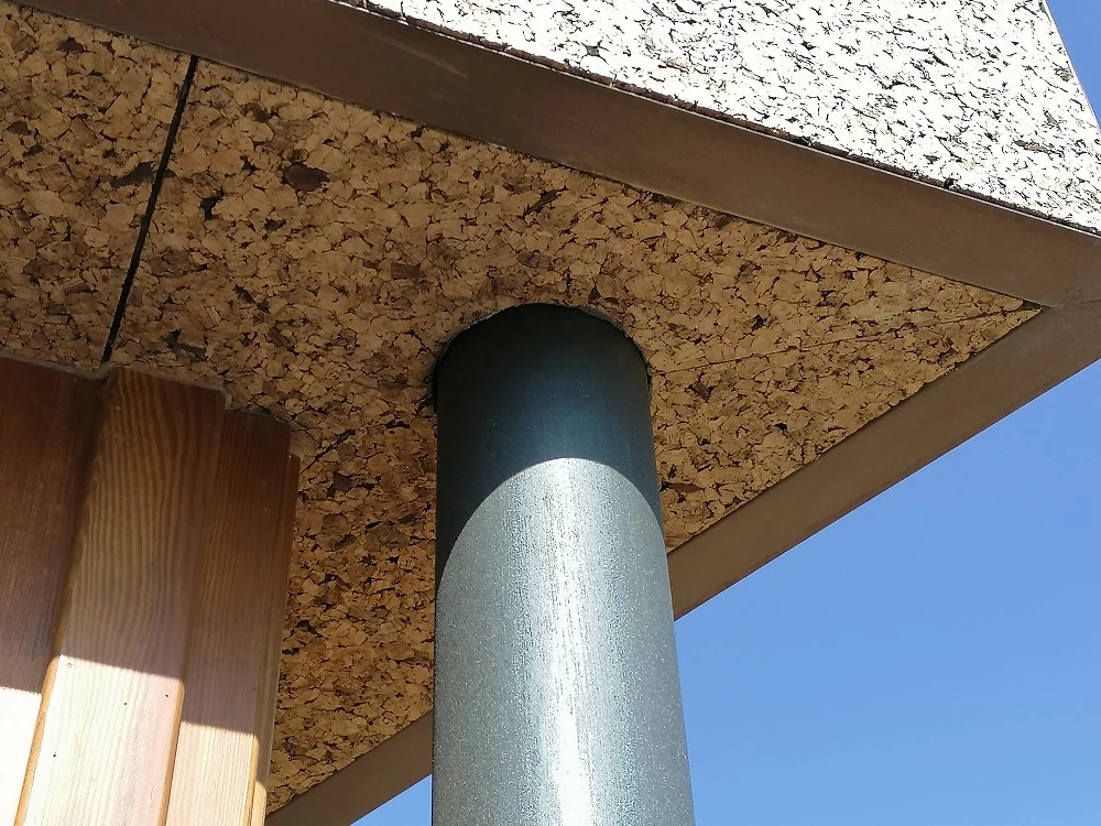 De kurk bespaart niet alleen energie en zorgt voor isolatie, maar zorgt er ook voor dat het gebouw naadloos opgaat in de natuurlijke omgeving. Het huis werd gebouwd voor een gepensioneerd echtpaar dat ervan droomde om midden in de natuur te wonen in een energiezuinige woning.